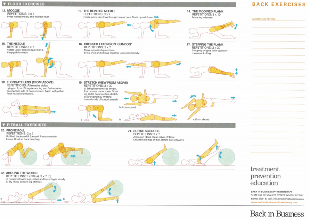 Post Traction Exercises are essentially those described above, whereby abdominal and bridging exercise in supine are complemented with oscillations of the pelvis and hips. From Supine, exercises in side lying, then in 4 point kneeling, are followed by isometrics in sitting and finally oscillatory movements in standing, including the wall plank, queen mum and Alexander breathing exercises.
