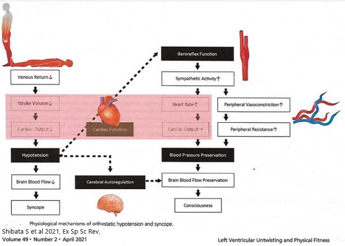 The heart plays a pivotal role or orthostasis, where left vetricular untwisting mechanics is critical for tolerating central hypovolaemia (as a result of reduced cardiac filling during orthostatic stress) in both high and low physical fitness people (Shibata S et al 2021, Ex Sp Sc Rev, 49, 2, 88-98).