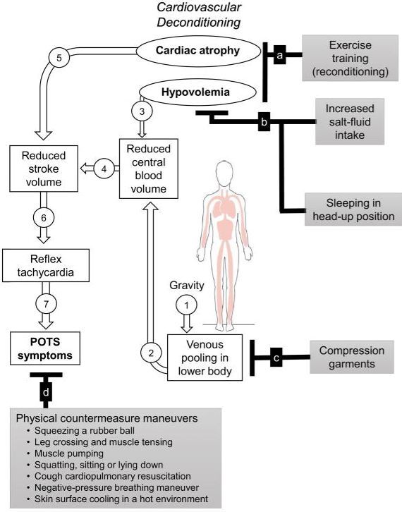 - cardiovascular autonomic dysregulation, where tachycardia occurs due to decreased stroke volume from low blood volume (hypovolemia). Exercise conditioning results in increased stroke volume. However, all factors of exercise prescription need to be addressed including hydration and diet.
